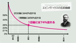 しかし!それは当然なんです。ドイツの心理学者ヘルマン・エビングハウスさんが「人間の脳がいかに忘れやすいのか」を実験し数値化してくれました。それが下図で、「エビングハウスの忘却曲線」と言い、それによるとたった20分後には42%も忘れるそうです。翌日に覚えているのはわずか26%…こんなに人って忘れっぽい生き物なんですね。でもそのおかげで悲しい事があってもやがて笑顔になれるのでしょう。