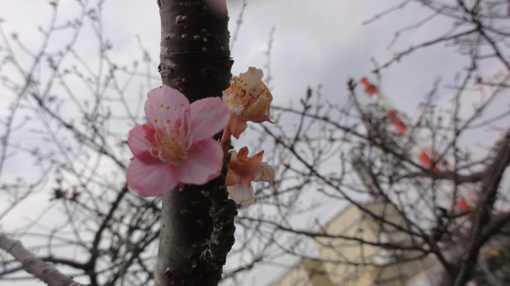 いわきでは勿来火力発電所で見ることができるのですが、今月に入り数輪咲きました。既に案内板やテーブル・椅子などが設置されています。河津桜は満開になるまでひと月ほどかかるので、今月いっぱいは楽しめそうです。見頃になりましたらまた写真をお届けしたいと思います。